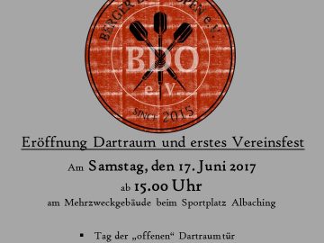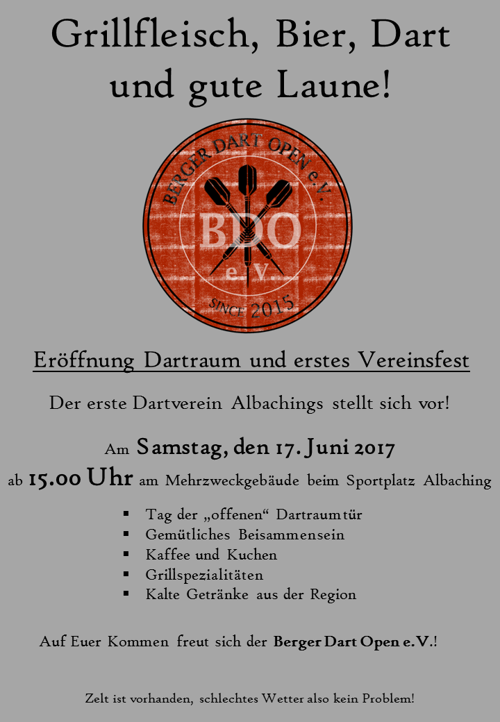 Am 17. Juni 2017 ab 15.00 Uhr findet am Mehrzweckgebäude am Sportplatz das erste Vereinsfest des neu gegründeten Berger Dart Open e.V. statt. Dazu sind alle Mitglieder, Freunde, Nachbarn und alle Vereine der Gemeinde Albaching herzlichst eingeladen.