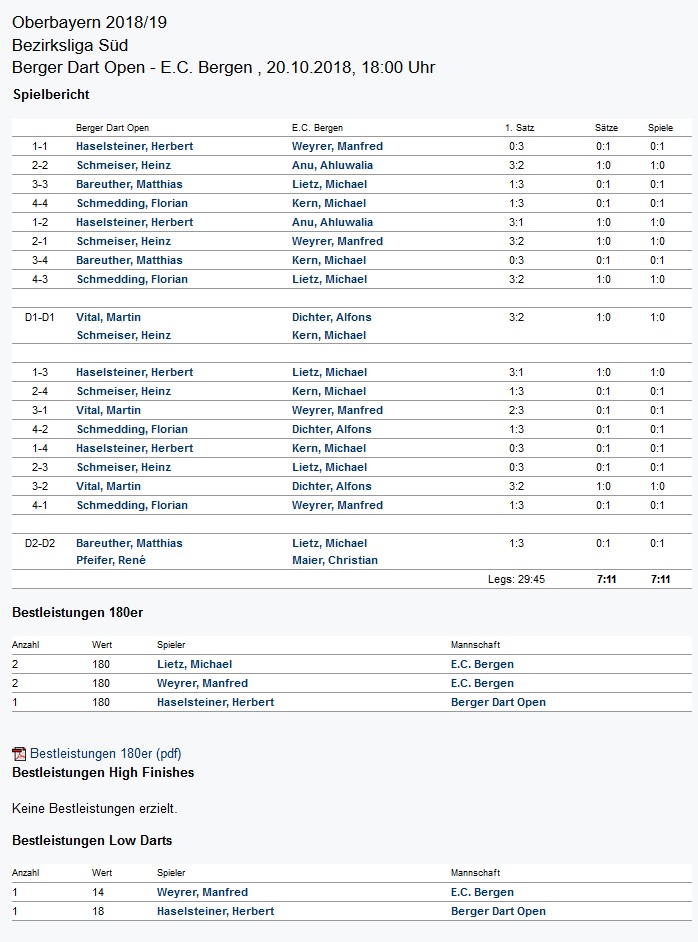 Das Fazit fällt dennoch durchaus positiv aus. Das Niveau ist wirklich hoch, Haselsteiner mit 180er und Short-Leg auf seiten des Berger Dart Open e.V., insgesamt gab es fünf 180er und unzählige 140er Aufnahmen. Das Highlight des Abends war ein 14 -Darter auf Seiten der Gäste. Jedenfalls braucht sich der Berger Dart Open e.V. mit seiner ersten Mannschaft nicht zu verstecken und kann sicher noch den ein oder anderen Sieg einfahren.