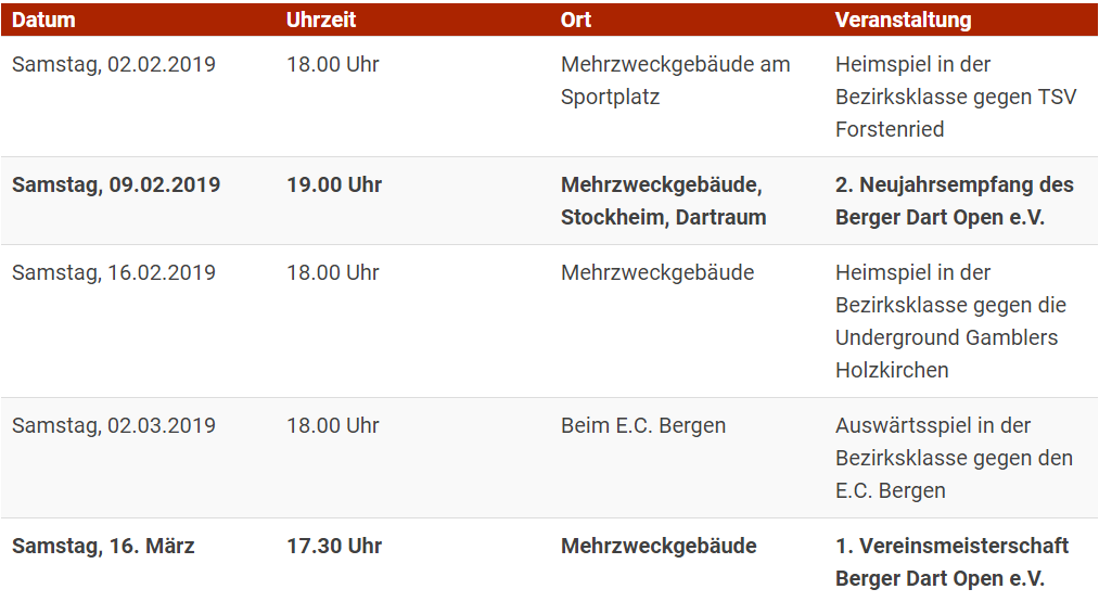 Das am 19.01.2019 geplante Heimspiel gegen Holzkirchen muss noch einmal verschoben werden. Der neue Termin ist der 16.02.2019, somit findet das letzte Heimspiel gegen Holzkirchen statt. Entscheidend wird es aber bereits zwei Wochen vorher. Gegen Forstenried (am 2. Februar) entscheidet sich wo es hingeht mit dem Berger Dart Open e.V.. Anwurf ist jeweils 18.00 Uhr. Das ist aber nicht alles, auch Neujahrsempfang und Vereinsmeisterschaft sind große Highlights bis Ostern. Alle Termine im Überblick: