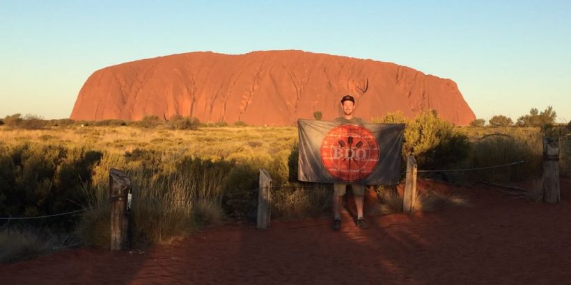 Falls ihr euch gefragt habt, wo eigentlich unsere Berger Dart Open – Fahne diesen Sommer über war, hier kommt die Antwort: Auf der anderen Seite der Erde – Down Under mit dem Sergeant… Vier Wochen lang war die Fahne im Juni und Juli ein steter Begleiter beim Durchqueren Australiens, ob mit dem Flugzeug, dem Bus oder per Auto…Ein Bild entstand am Uluru, das andere am Whitehaven Beach.