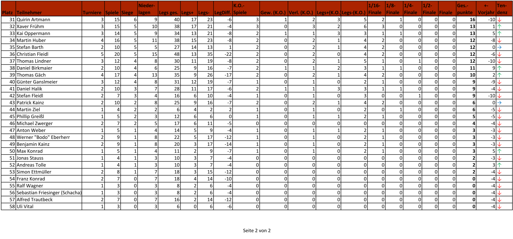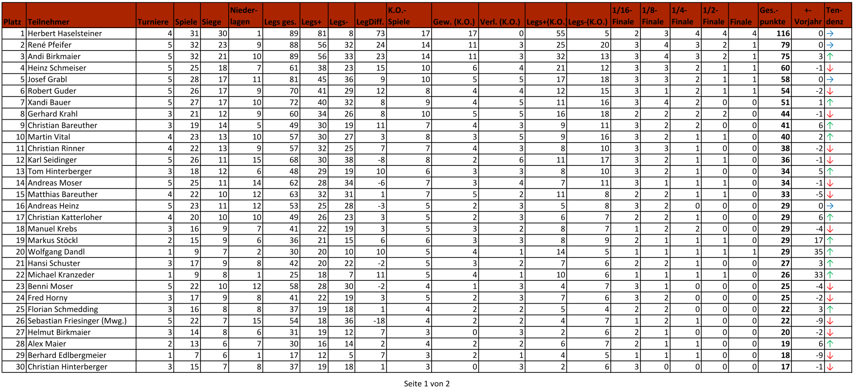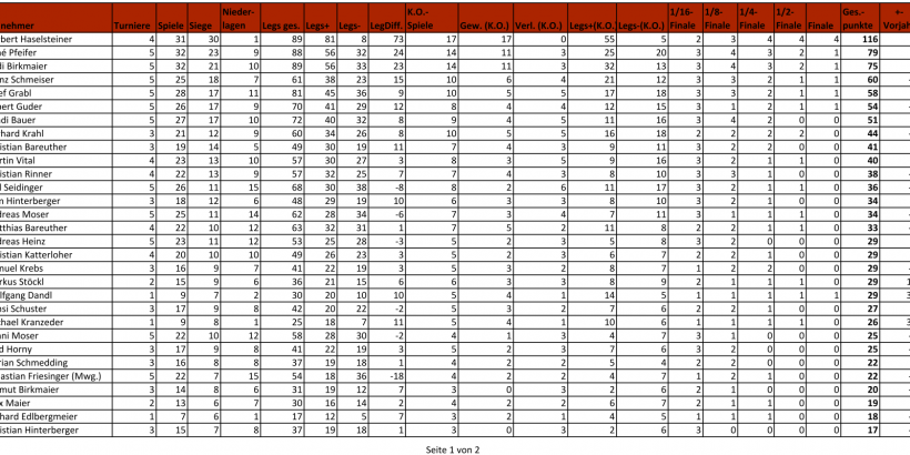| Platz | Teil- nehmer | Tur- niere | Sp. | Siege | Nied.- lagen | Legs ges. | Legs + | Legs - | Leg Diff. | K.O.- Spiele | Gew. (K.O.) | Verl. (K.O.) | Legs+ (K.O.) | Legs- (K.O.) | 1/16- Finale | 1/8- Finale | 1/4- Finale | 1/2- Finale | Finale | Ges.- punkte | +- Vorj. | Tend. |