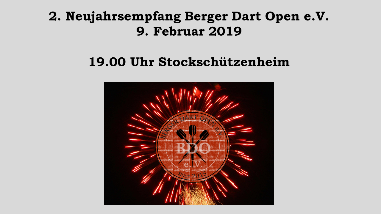 …dann feiern wir uns selbst! Der Neujahrsempfang des Berger Dart Open e.V. findet morgen (Samstag, 9. Februar ab 19.00 Uhr) in den Hallen der benachbarten Stockschützen des SVA statt. Morgen ist auch der letzte Termin zur Anmeldung für die Vereinsmeisterschaft am 16. März.
