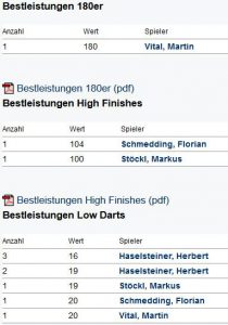 Die erste Mannschaft, mit Kapitän Haselsteiner, zeigte erwartungsgemäß am Samstag Ihr ganzes Können. Higfinishes und Short Legs am laufenden Band. Alle Spieler des Berger Dart Open e.V. trugen sich in die Liste der Bestleistungen ein. Das ist bis jetzt so noch nicht vorgekommen. Die Gegner aus Holzkirchen hatten überhaupt keine Chance. 17:1 war der Endstand für der Berger Dart Open e.V.. Die Bestleistungen vom Samstag findet Ihr im Screenshot unten. Die erste rangiert somit auf dem 3. Tabellenplatz und kann diesen mit einem Sieg am kommenden Samstag weiter festigen.
