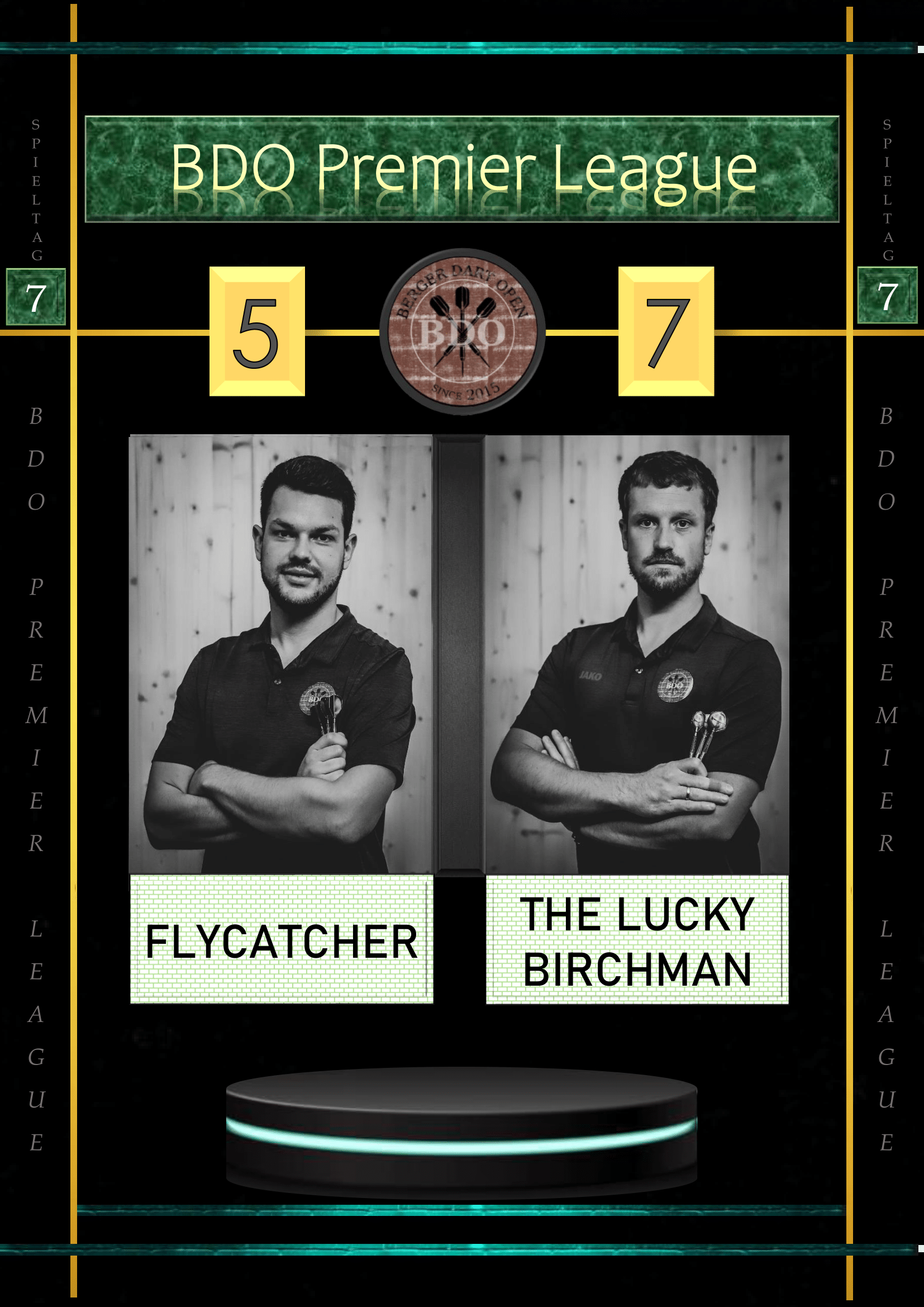 Der Flycatcher wollte sich zum Abschluss mit einem Sieg verabschieden. In einem Match auf absoluter Augenhöhe schenkte er sich nichts gegen den Lucky Birchman, der zumindest noch den Sprung auf Platz 5 schaffen konnte. Dementsprechend wechselten die Legs immer wieder hin und her. Es war nicht abzusehen, wer das Match für sich entscheiden würde. So kam es zum alles entscheidenden Decider, den der Birchman schlussendlich für sich entscheiden konnte. In seinem letzten Spiel war der Gladiator nochmals äußerst motiviert, dem Primus des BDO, The Irish One, nochmals richtig zu ärgern. Nach 1:0 Führung musste er sich jedoch einer Reihe von Legs ergeben und lag zwischenzeitlich bereits mit 1:5 hinten. Alles sah nach einem klaren Sieg für The Irish One aus. Doch dann kam das letzte aufbäumen des Gladiators und er holte sich 3 der nächsten 4 Legs und es sah lange danach aus, als würde ein Unentschieden doch noch machbar sein. Mit all seiner Erfahrung ließ das The Irish One nicht mehr zu und holte seinen 5.Sieg im 7.Spiel. Ob es für Platz 1 in der Tabelle gereicht hat, hing vom Spiel des Marksman gegen den Ironman ab. Bereits ein Unentschieden sollte dem Marksman reichen, um an der Spitze zu bleiben. Das Match gestaltete sich abermals auf Augenhöhe und ging zunächst in wechselnden Gewinnlegs vonstatten. Beim Stand von 3:2 für den Ironman konnte der Marksman eine erste Serie starten und 3 Legs in Folge holen. Postwendend kam die Antwort des Ironmans und somit stand es 5:5. Beflügelt von 5(!) perfekten Darts lag der psychologische Vorteil zwar beim Ironman, doch es kam anders wie erwartet. Der Marksman behielt die besseren Nerven und sicherte sich die letzten beiden Legs zum Sieg. Mit größter Spannung wurde das Spiel The Mullet gegen Freestyler erwartet. Der Freestyler musste zwingend gewinnen, um noch auf Platz 4 springen zu können. Mit absolut stabiler Leistung konnte er das Match durchgehend bestimmen und lies keine Zweifel daran, wer als Sieger das Oche verlässt. Für The Mullet war es ein gebrauchter Tag. Er hatte sich viel mehr vorgenommen, jedoch konnte er seine Stärken aus den letzten Partien nicht in das entscheidende am 7.Spieltag mitnehmen.